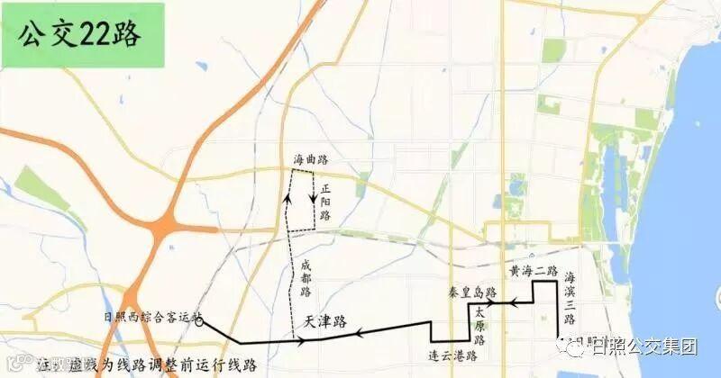 22路:原运行成都路、日照路、海曲路、正阳路、迎宾路路段停止运行,调整为天津路(成都路至柳州路)、柳州路路段运行。原运行黄海一路(海滨五路至海滨三路)路段停止运行,调整为海滨五路、黄海二路(海滨五路至海滨三路)、海滨三路路段运行。撤销“港口医院、市工商银行、成都路天津路、大岭二村、大岭三村、大岭一村、新华三街生活区、小岭村、锦华锦城、汽车总站、华益大厦、苏宁诺富特酒店、正阳路福海路、东港公安分局、九点阳光东门、九点阳光”站,增设“港生活一区、中铁二十三局一公司、市农发行、山水大酒店、市工商银行西、火车站南(路南)、天津路绍兴路、天津路南昌路、日照西综合客运站”站。