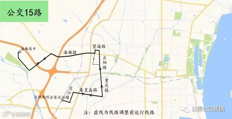 15路:原运行兴海路、日照路(兴海路至海曲路)路段停止运行,调整为正阳路(兴海路至迎宾路)、重庆路、秦皇岛路、长沙路、柳州路路段运行。撤销“实验四小、东港区检察院、汽车总站、华益大厦”站,增设“东港公安分局、九点阳光东门、重庆路北口、重庆路大连路、秦皇岛路重庆路、秦皇岛路成都路、开发区车管所、秦皇岛路南昌路、长沙路大同路、日照西综合客运站”站。