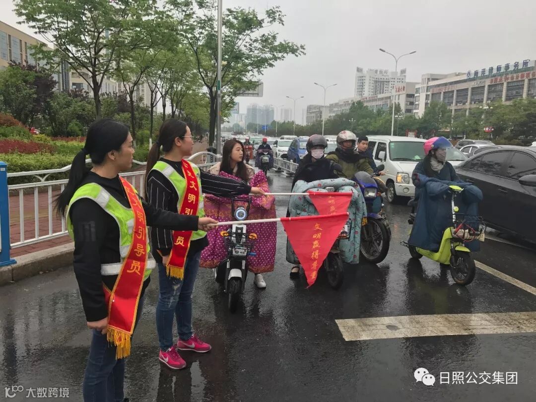 5月11日早上7:20—8:30,市公交集团志愿者到泰安路与北京路路口(银座路口)配合执勤交警,开展了“礼让斑马线,我为您点赞”文明劝导体验活动。公交集团志愿者身穿反光衣、手持指挥旗、头戴志愿者帽子,在繁忙的路口为市民的交通安全保驾护航。当时正下着雨,公交志愿者们在雨中坚持执勤,认真履行交通劝导职责,热情劝导行人遵守交通规则,详细解答过路群众的问询,引导市民文明驾车、文明行路、遵章出行,营造了良好的文明礼让出行氛围。
