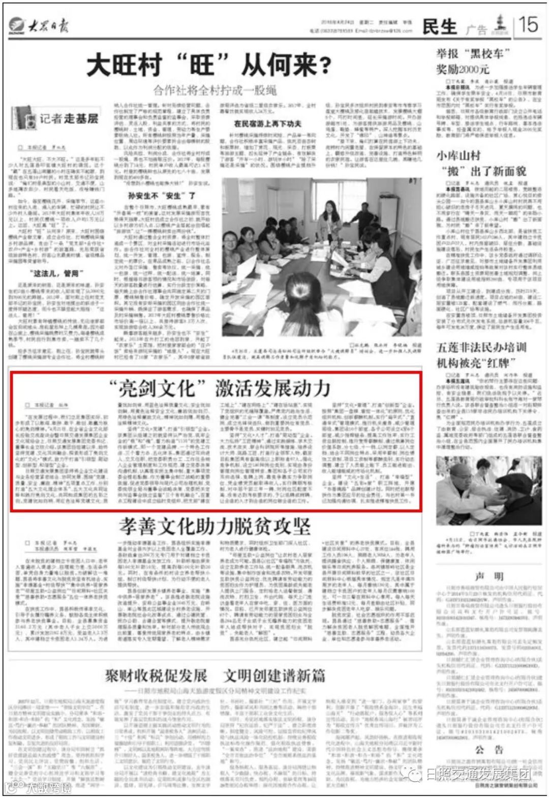 4月21日,全省企业文化部长经验交流座谈会上,日照交通发展集团党委书记、董事长金立柱题为《坚持党建文化引领 弘扬五彩亮剑文化》发言引起了与会人员的强烈共鸣,一致认为该集团的“五彩亮剑企业文化”亮出了摄动灵魂的力量,亮出了齐鲁企业文化新样板,被授予“山东省企业文化建设示范基地”荣誉称号,并在全省推广。