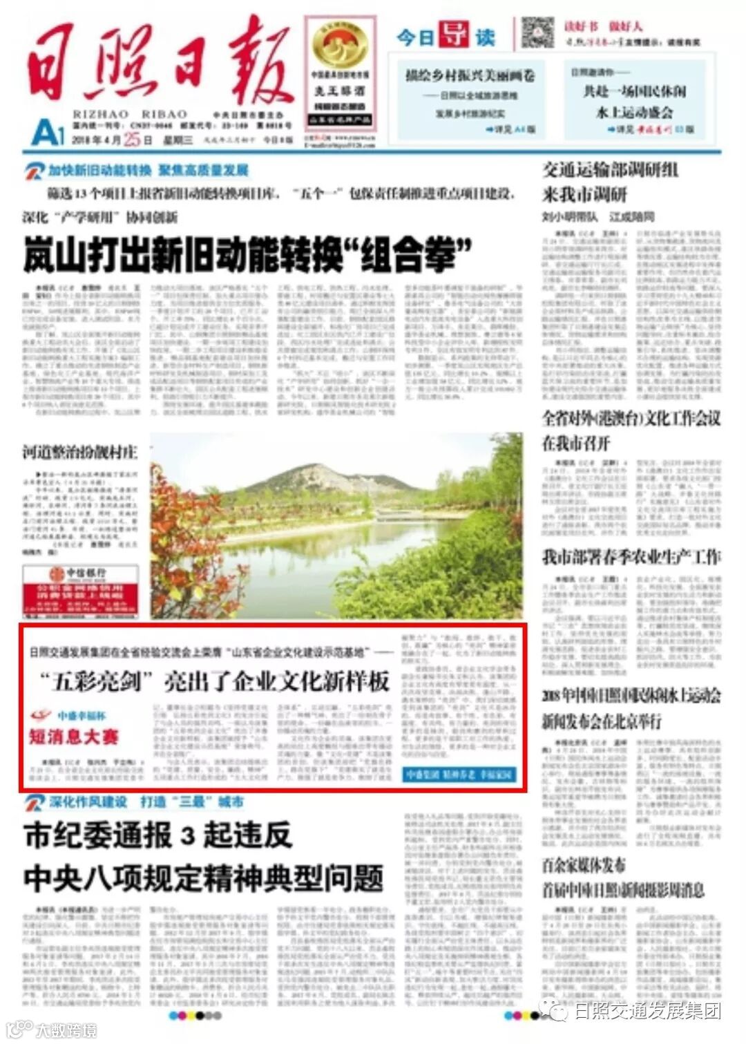 “在发展过程中,我们立足集团实际,初步形成了以敢闯、敢拼、敢干、敢创、敢赢为核心的亮剑精神。”4月21日,在全省企业文化部长经验交流座谈会暨日照交通发展集团企业文化现场会上,日照交通发展集团党委书记、董事长金立柱介绍。该集团自组建以来,始终坚持党建、文化双向融合,探索形成了亮剑文化的“文化+”模式,致力于打造“引领型、驱动型、创新型、幸福型”企业。