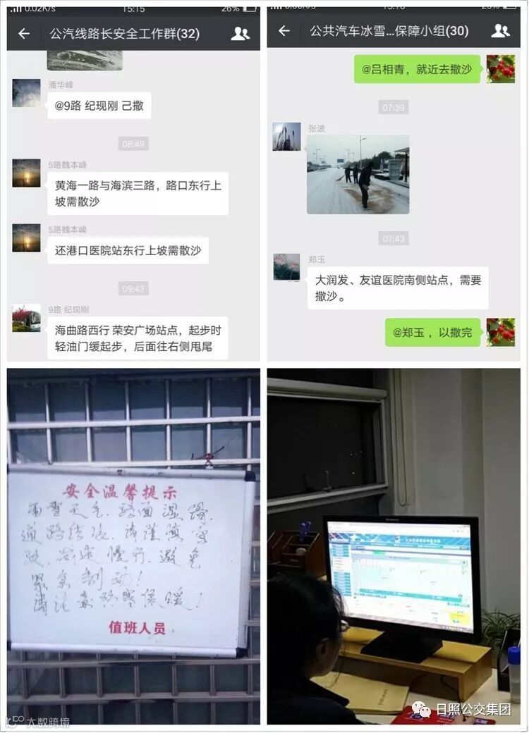 "叮铃!叮铃!微信工作群里一张张保障照片,寒冷中充澈着一股齐心协力的热乎劲"。为保障信息畅通,公司通过建立保障调度微信群、场站小黑板等方式确保工作及时性。公司总调度与二级调度协调通过系统及时向驾驶员发送安全指示和冰雪天气的安全行车提示,确保行车安全;保障期间,公司后勤管理人员在线路首班发车前分工对易积雪路段、事故易发危险路段进行勘察,通过微信群发布勘察情况,各线路结合路况针对性进行安全保障。