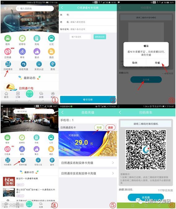 用户可关注“日照公交集团”微信订阅号,下载公交集团“新出行”手机APP,安装并注册成功后点击日照通扫码乘车功能,输入姓名、身份证号手机验证码开通日照通虚料卡充值后即可实现扫码乘车。