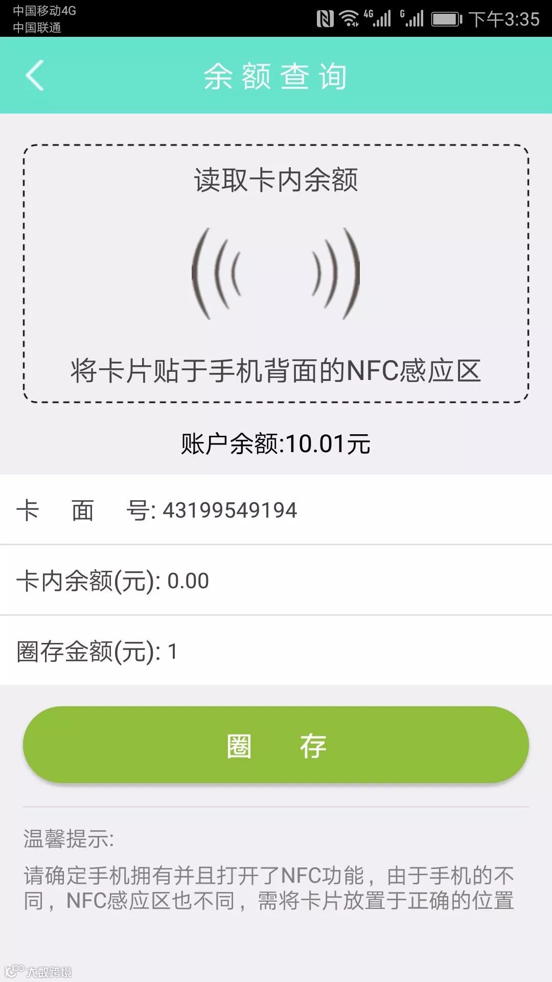 拥有自带NFC功能的手机的市民,确认手机NFC功能打开后,可直接点击APP中的NFC圈存功能,将日照通卡贴在手机NFC识别区域,完成日照通卡读卡圈存。