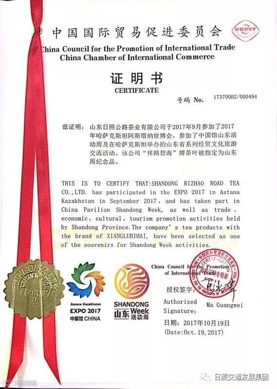 10月19日,中国国际贸易促进委员会传送喜讯,“祥路碧海”牌茶叶被指定为哈萨克斯坦阿斯塔纳世博会山东周纪念品。