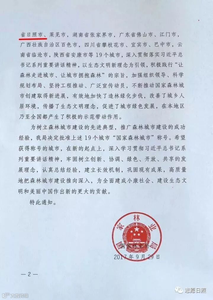 9月18日,国家林业局宣传办公布信息,对拟批准为2017年度国家森林城市名单进行公示。全国共有19市入围公示名单,日照市榜上有名。经过一周的公示后,日照市成功获得“国家森林城市”称号,并在会上接受授牌。