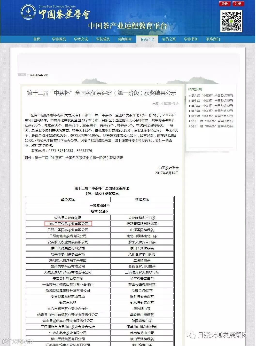 近日,第12届“中茶杯”全国名优茶评比(第一阶段)获奖结果揭晓,山东日照公路茶业有限公司旗下“祥路碧海”牌日照绿茶荣获本次绿茶评比一等奖。