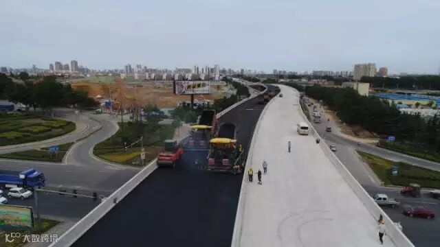 阳光照耀下的迎宾路跨线桥十分壮观,雄姿初展。走上桥面可以看到,两台摊铺机并行作业,压路机紧随压实,整个铺筑工作一环紧扣一环,正有条不紊开展。不多时,黝黑的沥青已覆盖在了桥面道路上,让人眼前一亮。