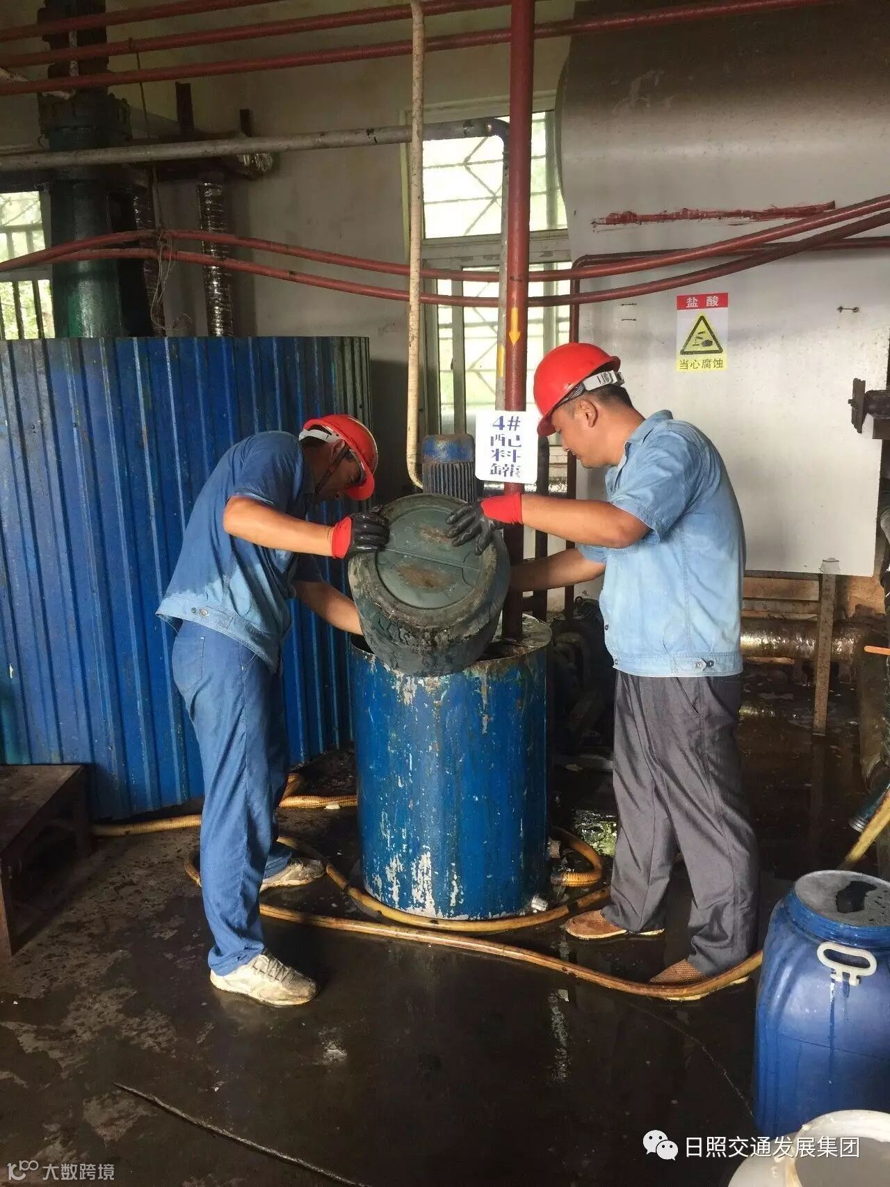 在沥青厂乳化沥青生产车间,配料区温度达到40多度。70多度的热水、140多度的沥青,还有刺鼻的盐酸气体,从配料罐口中喷涌而出,在这样的工作环境下,沥青生产工人要穿上防护服、戴上厚手套,职工身上的工作服,一次次的被汗水打湿,又一次次的被热浪烤干。一线员工严格按照生产工艺要求操作,保证每一批生产的乳化沥青质量符合要求,并保证设备稳定运行。