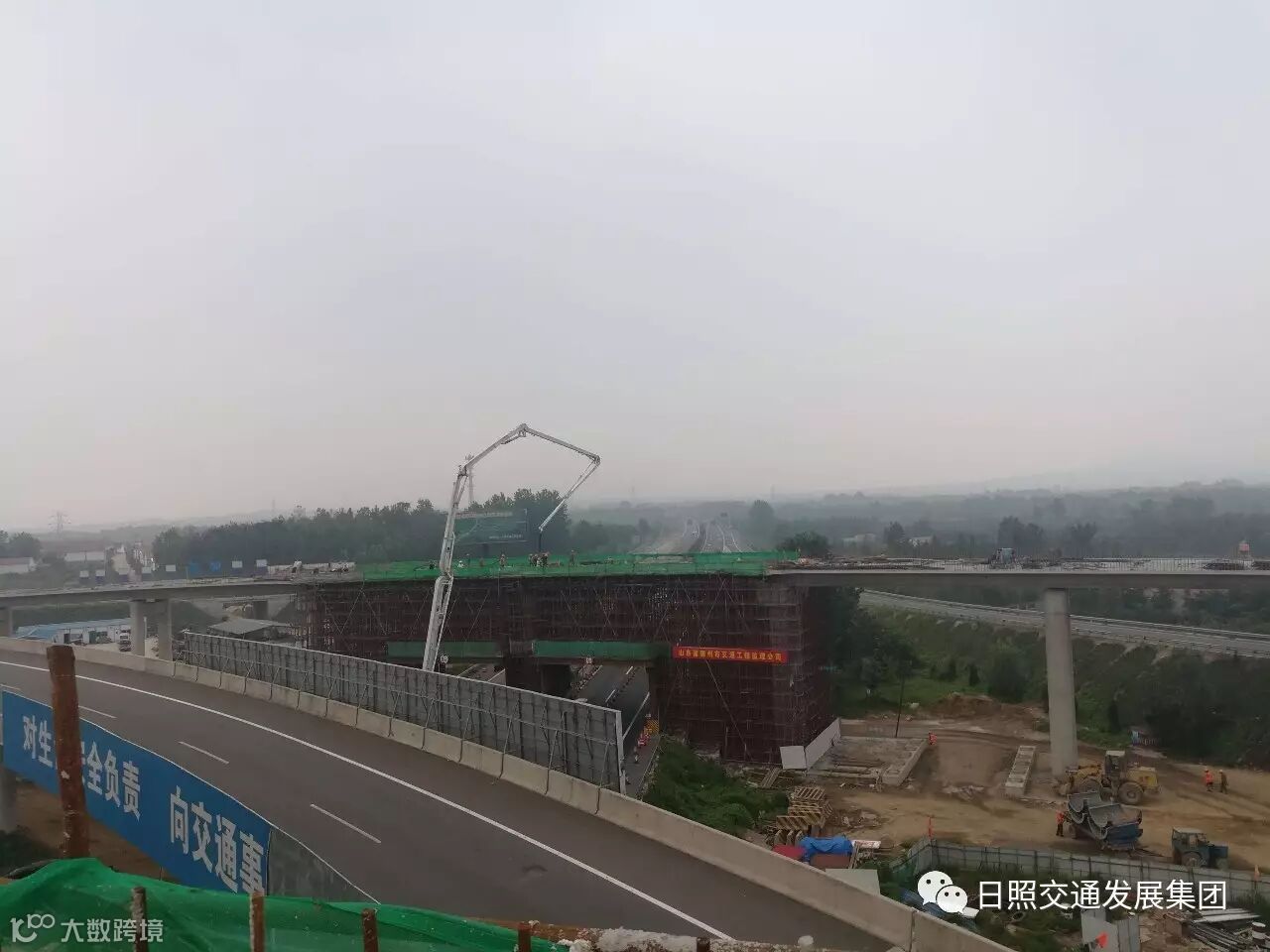 日照南互通立交现浇箱梁主体共计29联,目前已完成21联,计划本月将完成上跨沈海高速主线的三联现浇箱梁;全长516米的付疃河大桥本月也将完成左半幅桥面铺装;主线路基填筑工程也已基本结束,现已开始路面基层施工。