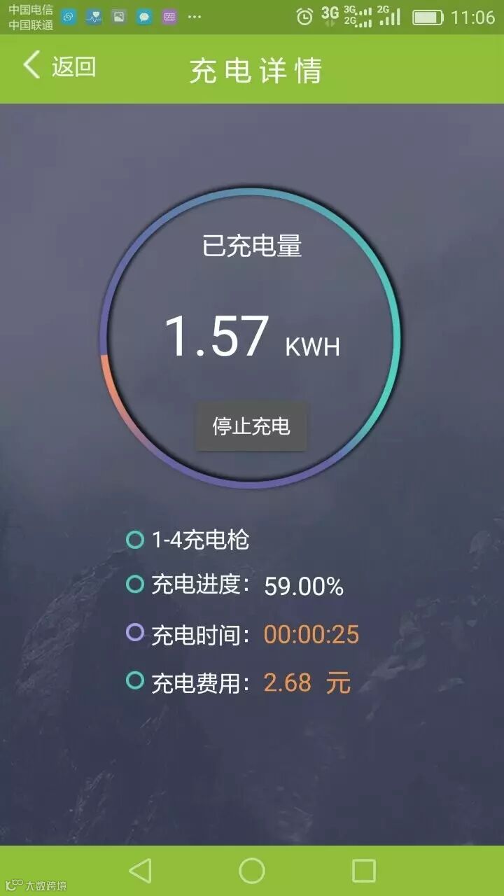 4. “充电详情”界面可查看充电详情,点击“停止充电,APP会跳转订单支付界面。