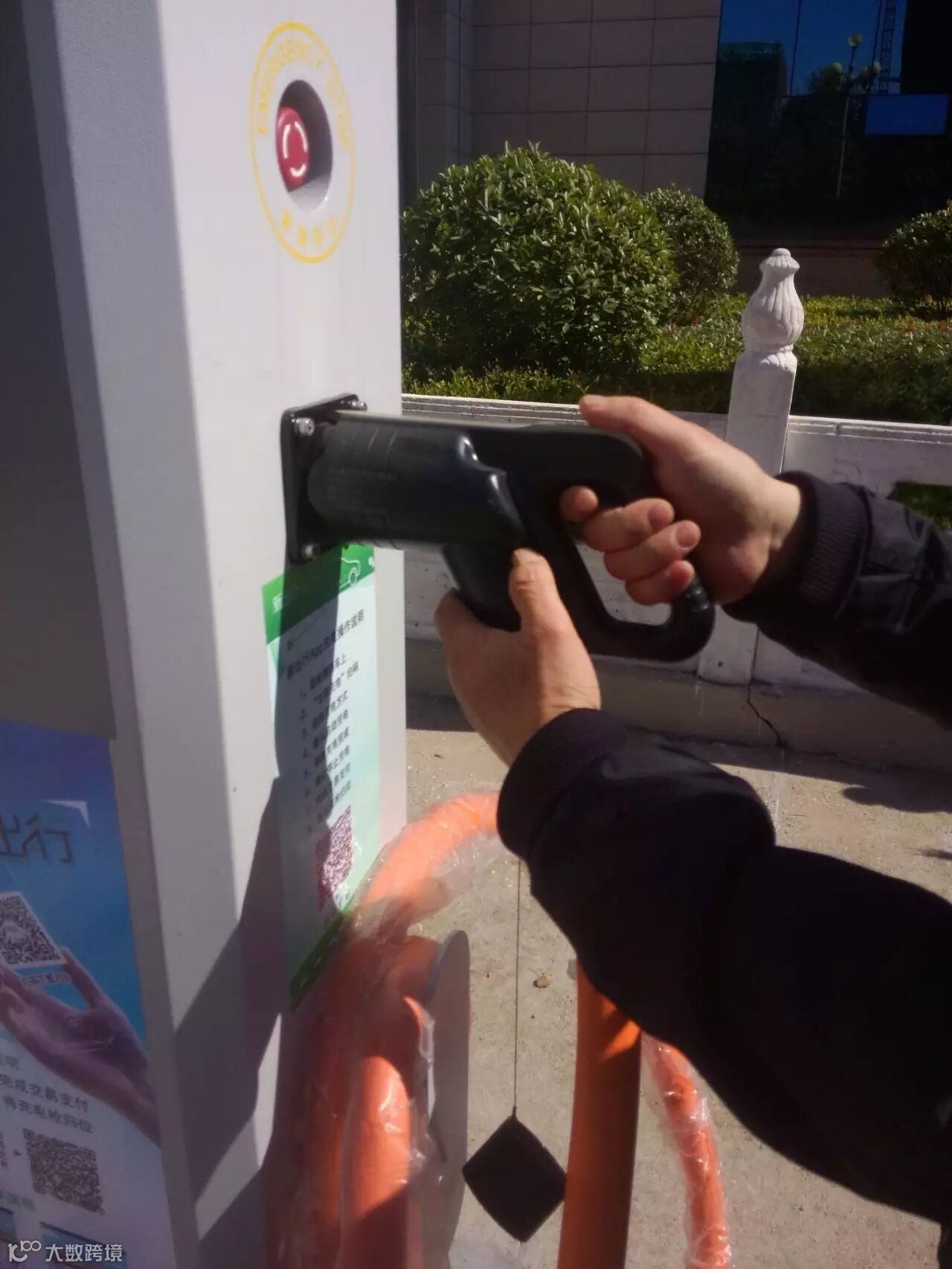 6、从车里充电口拔出充电枪,放到充电桩插口,如图: