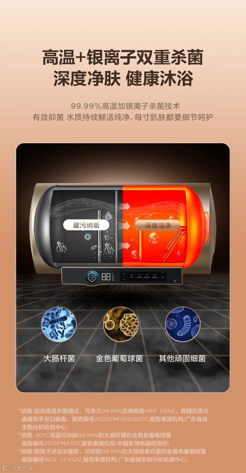 对于家里有老人的家庭来说,他们皮肤比较敏感,普通洗澡水中的杂质、余氯、细菌等可能会造成他们皮肤瘙痒、过敏等。因此选购一台有抑菌功能的电热水器,高温加银离子双重杀菌技术,可以杀灭99.99%病毒细菌,保持水质持续鲜活纯净,让全家人安心沐浴,保障每个家庭成员的身体健康。