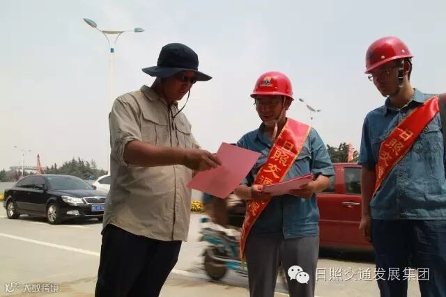 日照交通发展集团工作人员现场发放迎宾路快捷路施工现场正确通行明白纸