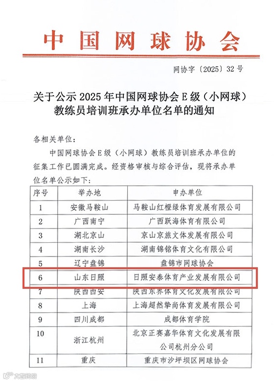 近日,中国网球协会公示了2025年中国网球协会E级(小网球)教练员培训班承办单位名单。全国11家单位入选,日照安泰体育产业发展有限公司榜上有名,成为山东省唯一入选该名单的企业。