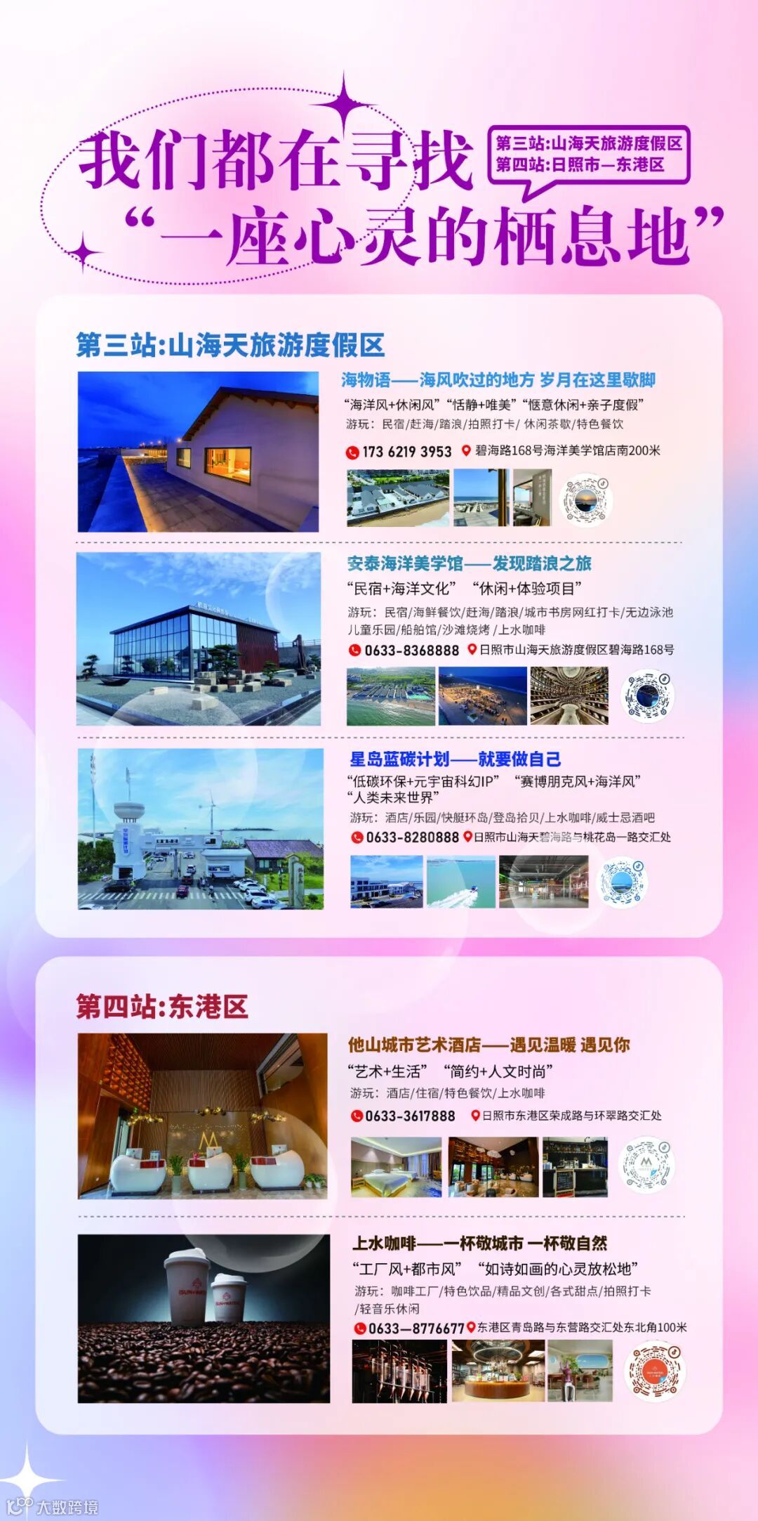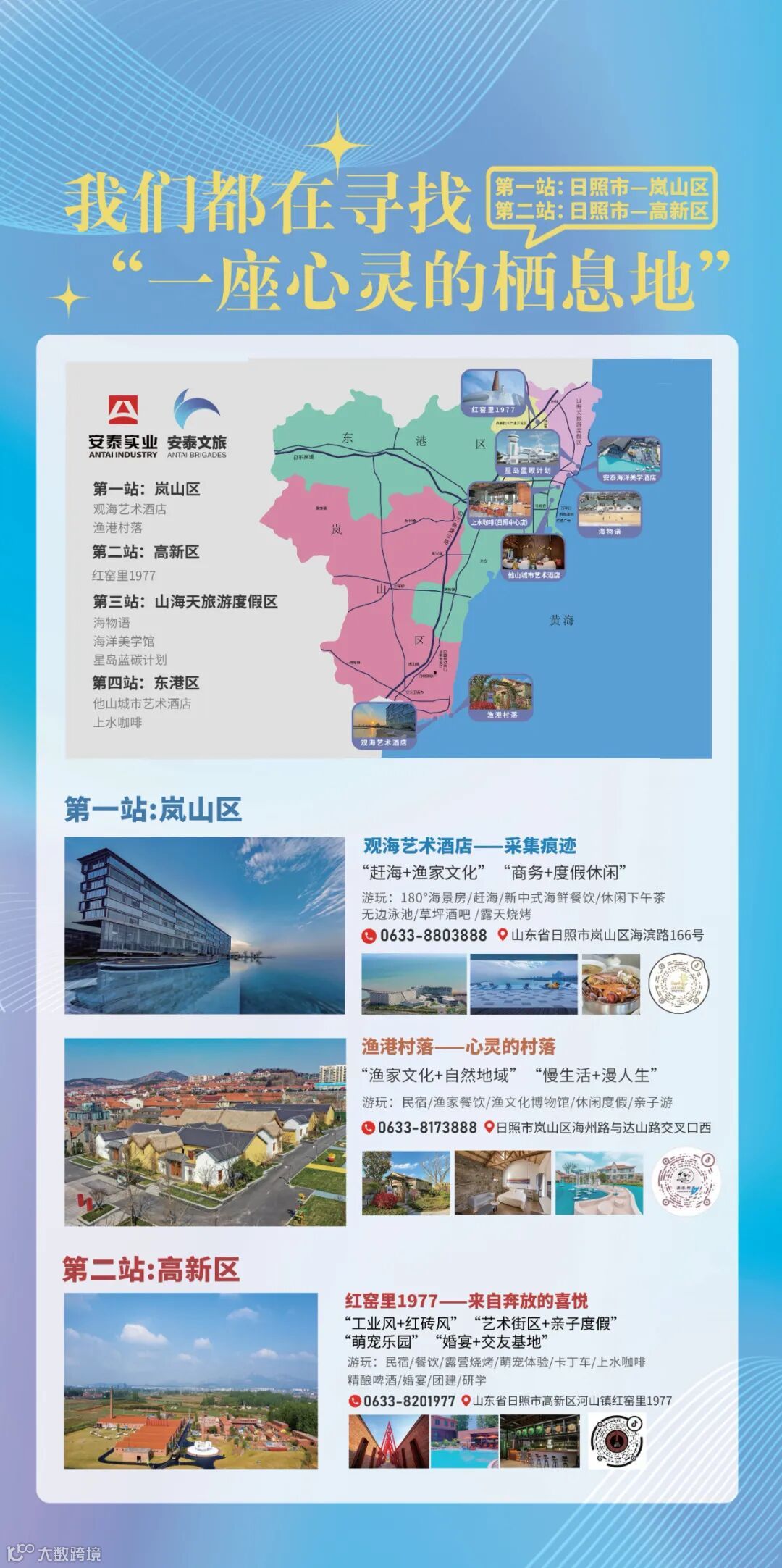 安泰文旅自主运营酒店、景区10余家,观海艺术酒店、海洋美学馆、星岛蓝碳计划、海物语、红窑里1977、渔港村落、青橙物语酒店、他山艺术酒店等是其中的优秀代表。
