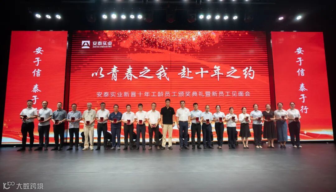 集团董事长别程远,党委书记、总经理别振远为新晋十年工龄员工颁发安泰金徽章。金灿灿的安泰徽章,印证着过往的拼搏努力,也让安泰人激情满满,赢战未来。