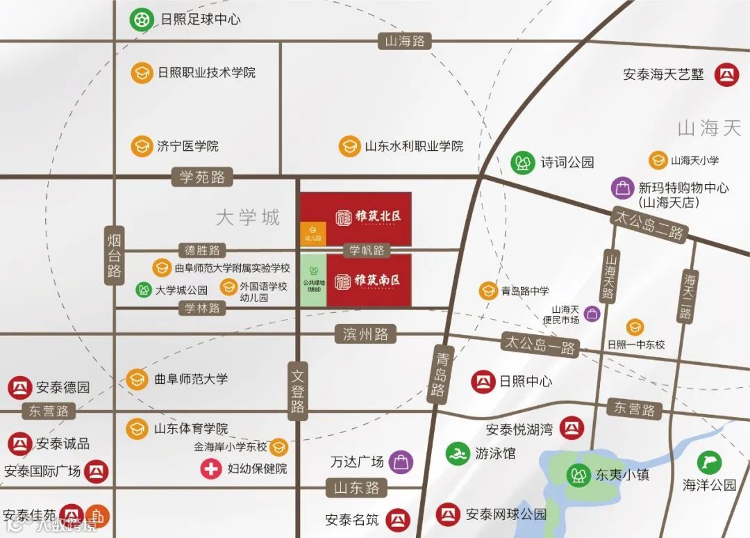 安泰雅筑(南区)位于日照市文登路与学林路交会处,与新市区、山海天相接,周边生活、生态、教育资源齐全。南区总建筑面积约10万平米,容积率约1.7,布局电梯洋房、观景小高层两种产品序列。