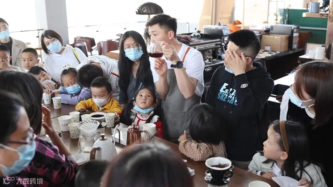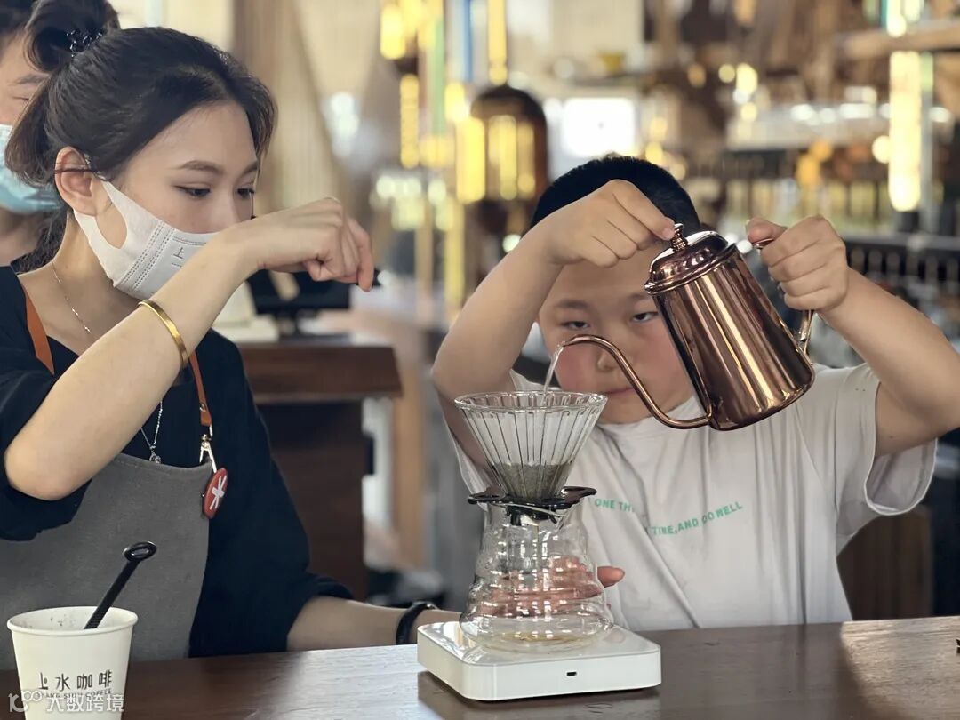 我们小小咖啡师们一个个都好厉害啊,学着咖啡师转动研磨机、冲泡手冲咖啡,时不时加点料,不一会儿 打开盖子 鼻子轻轻一嗅,哇~满满的咖啡香气扑鼻而来