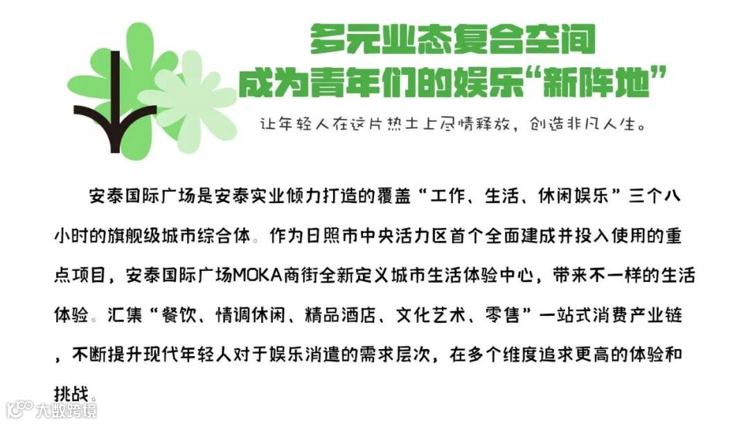 安泰国际广场是安泰实业倾力打造的覆盖“工作、生活、休闲娱乐”三个八小时的旗舰级城市综合体。作为日照市中央活力区首个全面建成并投入使用的重点项目,安泰国际广场MOKA商街全新定义城市生活体验中心,带来不一样的生活体验。汇集“餐饮、情调休闲、精品酒店、文化艺术、零售”一站式消费产业链,塑造日照都市生活新地标。