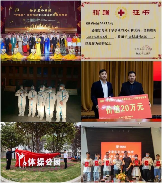 2021年,安泰公益彰显使命担当。为五莲疫情捐款50万元,组建医疗队,驰援疫情防控工作;出资100万元,支持日照市原创形象歌曲征集工作,用歌声唱响日照;出资30万元捐建新营中学体操公园,捐赠20万元为环卫工人购买御寒保暖物资,出资为云南西双版纳建设了南糯山篮球场。
