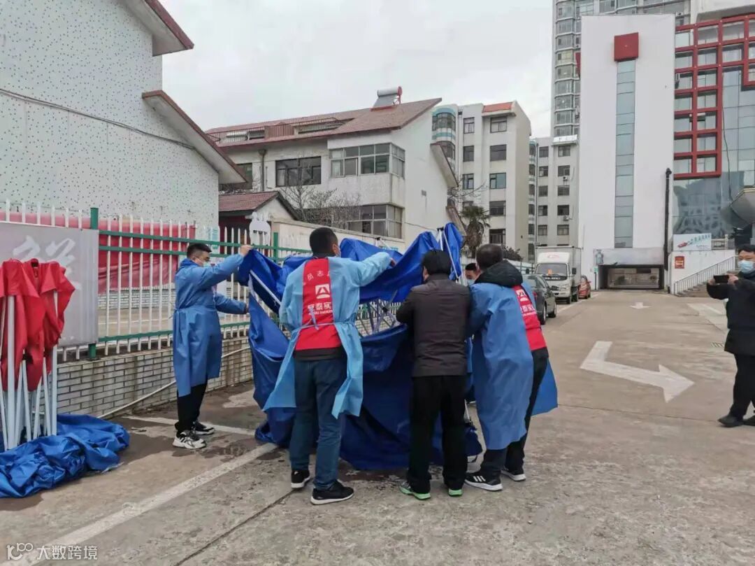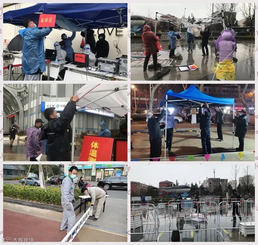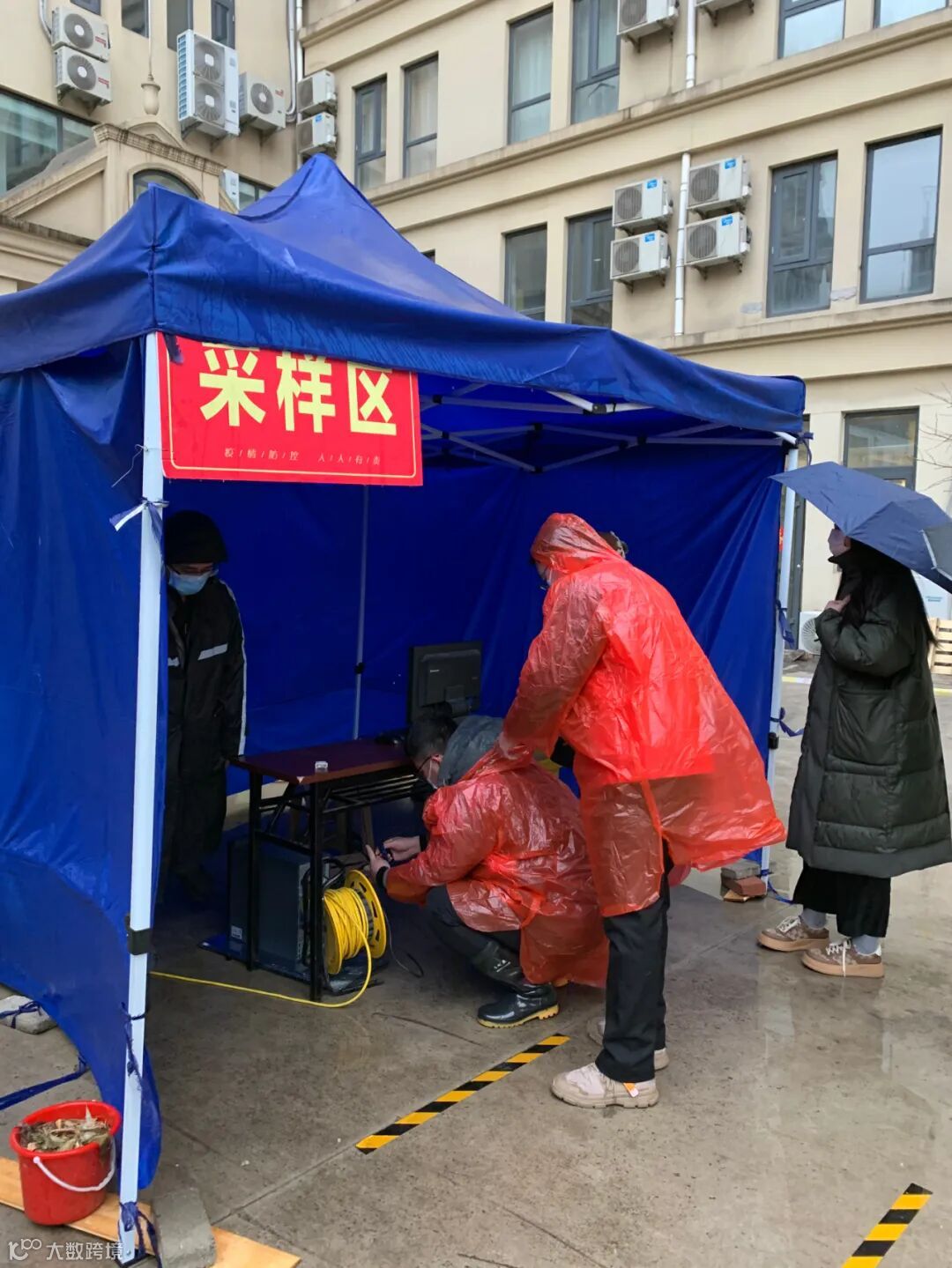 核酸检测要求每天早上6:00正式开始,物业人员在社区指导下,连夜架设检测点帐篷、围铁马、摆放桌椅、拉电缆、张贴一米间隔线,并提前调试,以确保第二天能够按时投入使用。