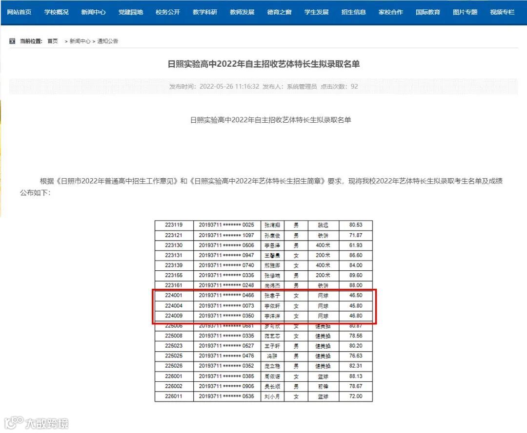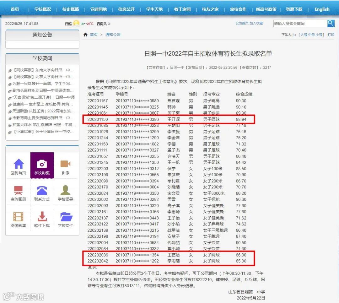 近日,日照市2022年体育特长生中考成绩公示,在网球特长生中考考试中共有6名学生被日照一中和日照实验高中录取,其中王开源、王艺洁、李雨晴被日照一中录取;张恚子、李依轩、李沣洋被实验高中录取,这6名学生全部为安泰网球俱乐部中考班学员,自2021年安泰网球俱乐部开展网球特长培训以来已有13名学生被录取。他们凭借自己在安泰网球俱乐部不懈的努力训练,通过网球中考体育特长生招生政策使自己在升学的道路上迈出坚实一步。