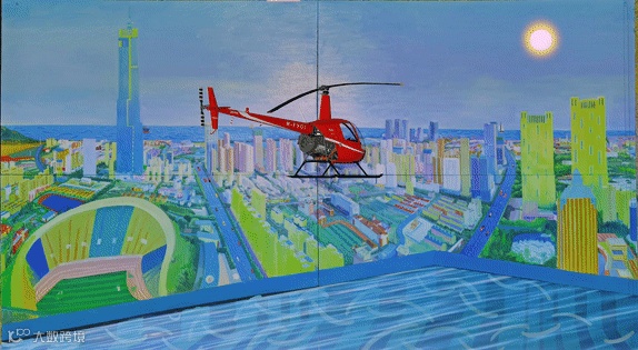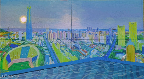 为展现日照这座海滨新城的活力和创新,画家一改以往写实城市风景的创作风格,选用绮丽绚烂的色彩搭配,衬托出城市的青春与时尚;画作中故意隐去了熙攘的人群和车流,由“上帝视角”俯看整座城市,试图使观者第一次抽离城市之外,来静静的欣赏这座我们每日置身其中,忽略甚而忘却这座伴随我们出生、长大、慢慢老去的“家”的美丽;这座我们世代相传、一点一滴自己建设创造出来的家乡!静谧的画作之后是动态的创意投影、沉浸式的声光电特效又将一座活力迸发、生机勃勃的日照版“清明上河图”栩栩展现,人群、车流、天空飞过的海鸥和远洋的货轮,你是否在其中找寻到了自己的身影!