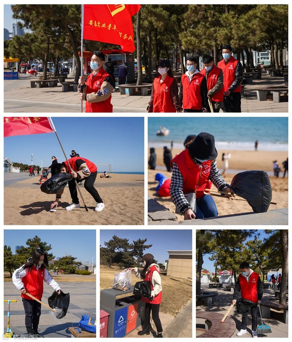 志愿者们手拎垃圾袋,沿途弯腰将散落在海滩上的果皮、纸屑、烟头、塑料袋等捡起。大家热情高昂,不放过任何一处的垃圾,安泰青年志愿服务队的旗帜迎风飘扬,身着红色马甲的志愿者成为海岸线上的一道靓丽风景。