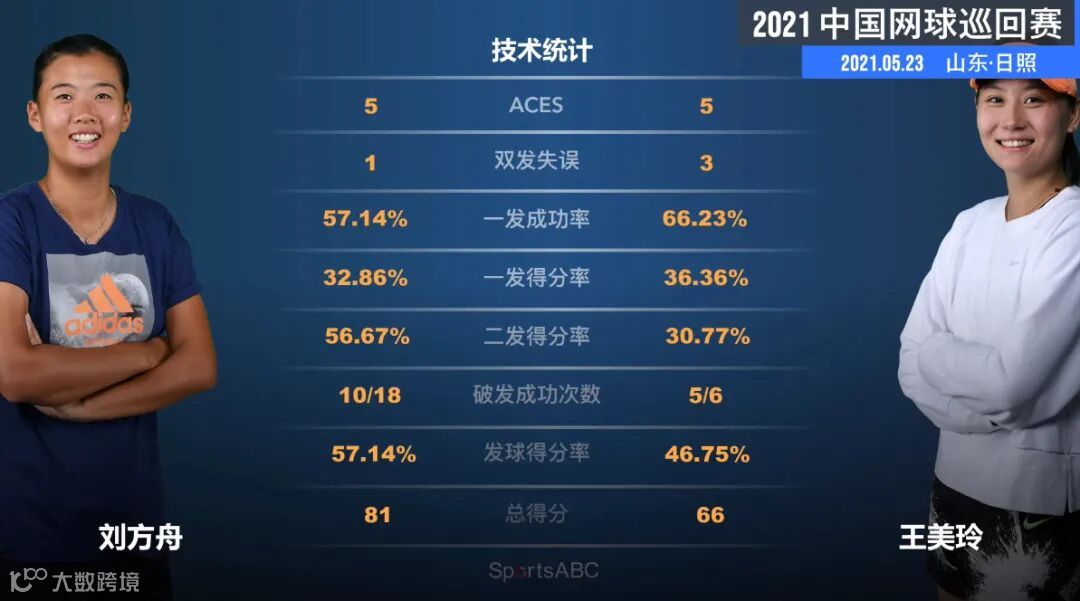 首盘比赛初期,双方在互破对手发球局后又相继保发,局分来到2:2。第5局王美玲发球状态出现波动,刘方舟抓住王美玲一发出界后二发质量不高的间隙成功破发并在随后自己的发球局当中顺利保发,首盘前6局比分2:4,王美玲落后。