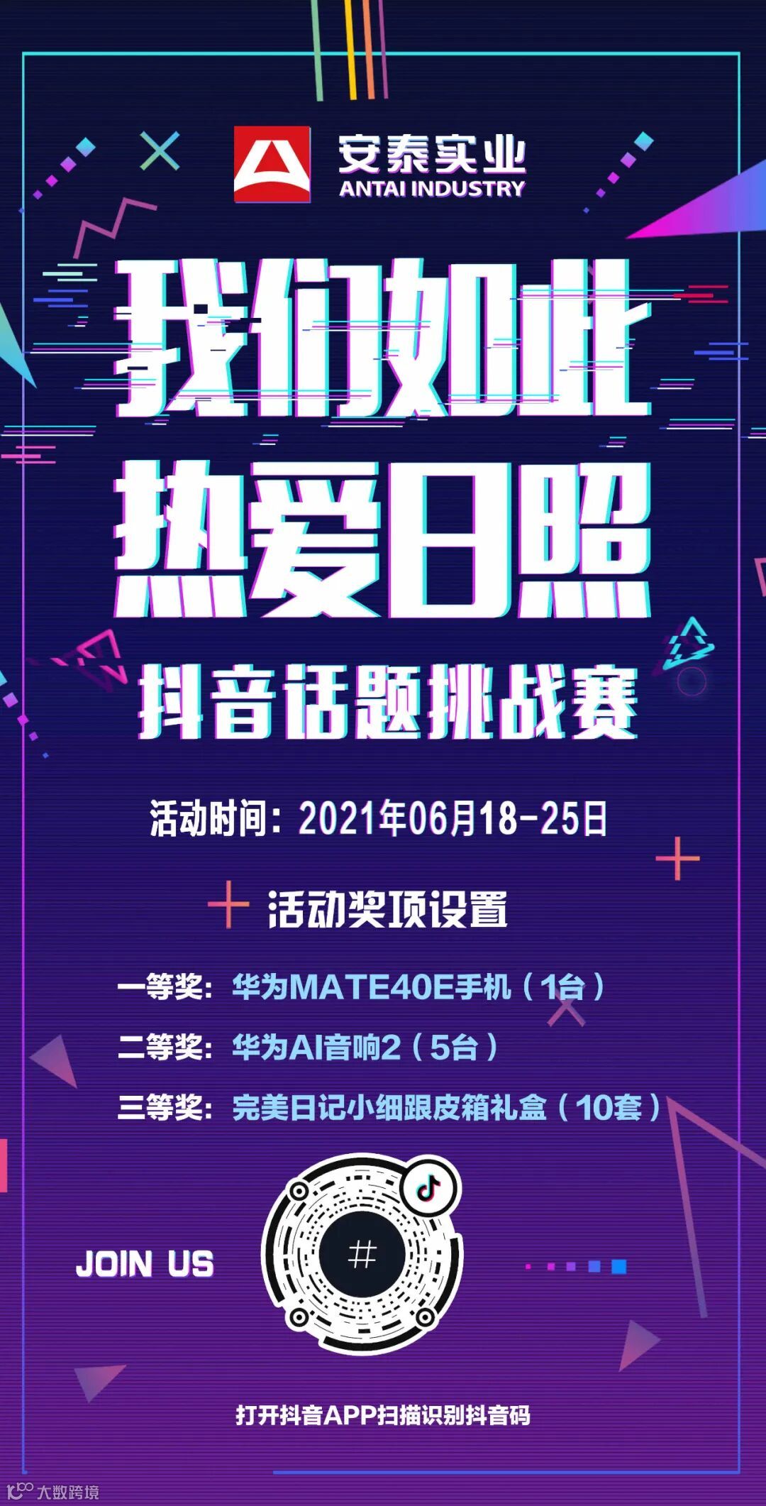 建党100周年来临之际,为挖掘和传播日照城市魅力,充分展示我市建市以来经济社会、人民生活的巨大变化,展现新时代背景下我市的新成就,2021年06月18日至2021年06月25日,安泰实业组织开展了”我们如此热爱日照“抖音线上话题挑战赛活动,以创新的方式,全方位、多角度、立体式展示我市的自然风光、发展成就、风土人情、人文情怀等城市魅力和文化底蕴,激发广大市民热爱家乡的深厚情感。