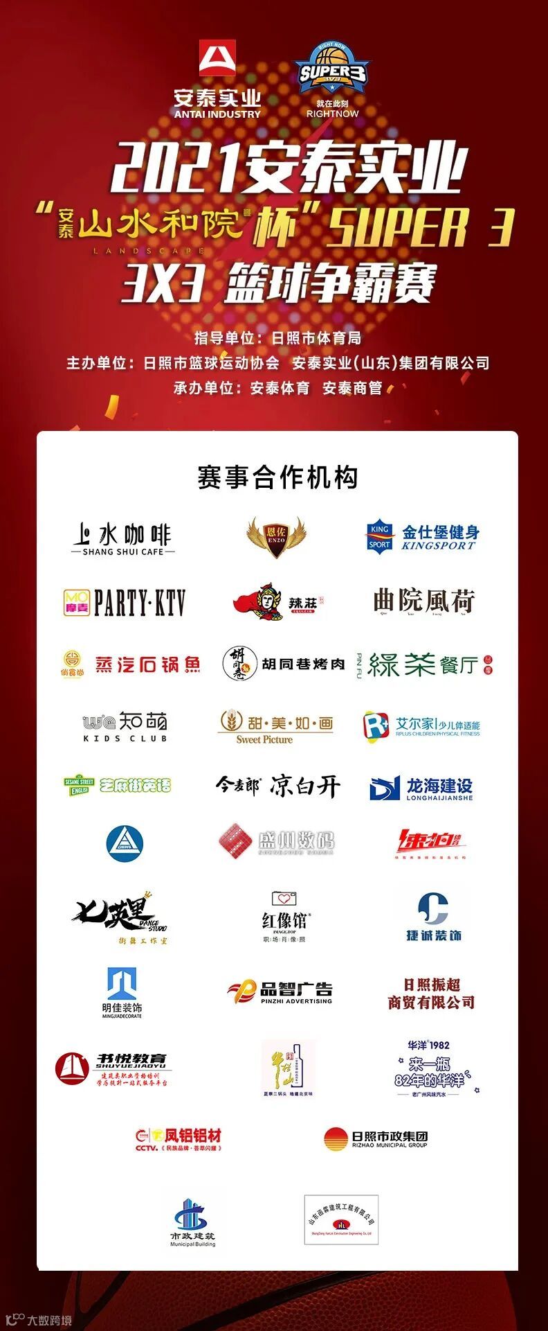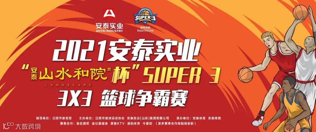 SUPER3 超级3×3篮球争霸赛是由日照市篮球运动协会、安泰实业主办,安泰体育、安泰商管承办,安泰山水和院冠名的全新赛制3V3篮球赛,特色的赛规和比赛方式在国内呼声极高。SUPER3的比赛宗旨是为热爱篮球运动、勇于挑战自我的Player提供专业的比赛平台和全新的赛事体验。