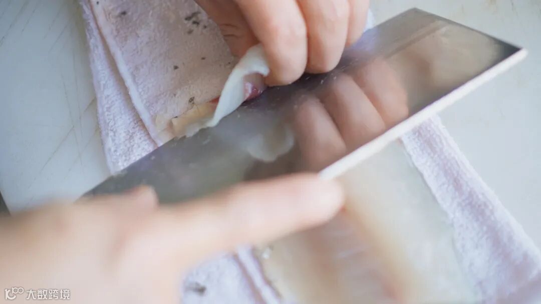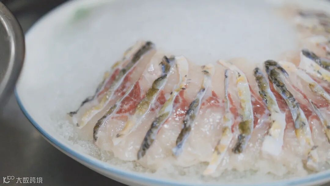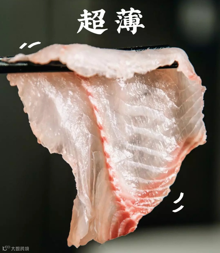 专业厨师用精湛的刀工一划,鱼肉被片片分解,厚薄均匀如同纸张般,切好的鱼肉,水嫩粉白,晶莹剔透,让人挪不开眼,一心只想赶紧把它们下锅。