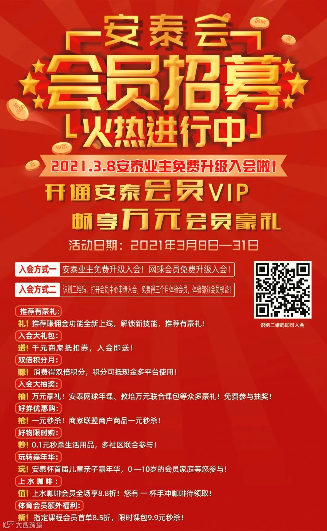 活动期间内(2021年3月8日10:00—31日17:00)会员登录安泰生活凭会员身份1积分即可参与入会大抽奖活动