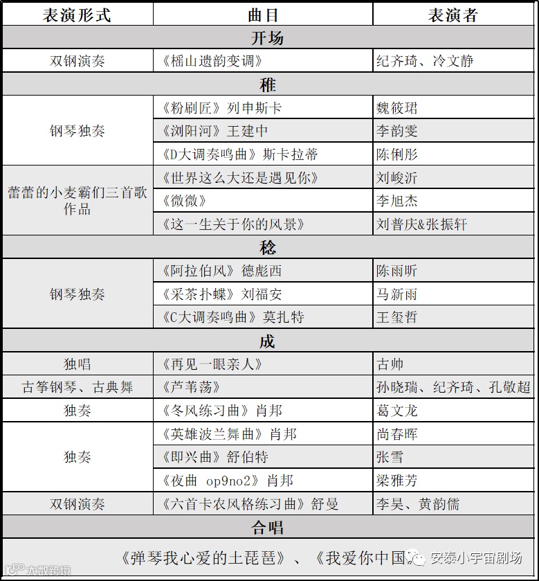 该场音乐会分为“稚”、“稔”、“成”三部分,用曲目的难度表述了音乐人的成长。音乐会的初衷就是从每次的观演中寻找属于自己的精彩和感动,无论你是大人还是琴童,学琴之路折射出人的一生,不仅是掌握技能,更好的去陶冶人的心境。