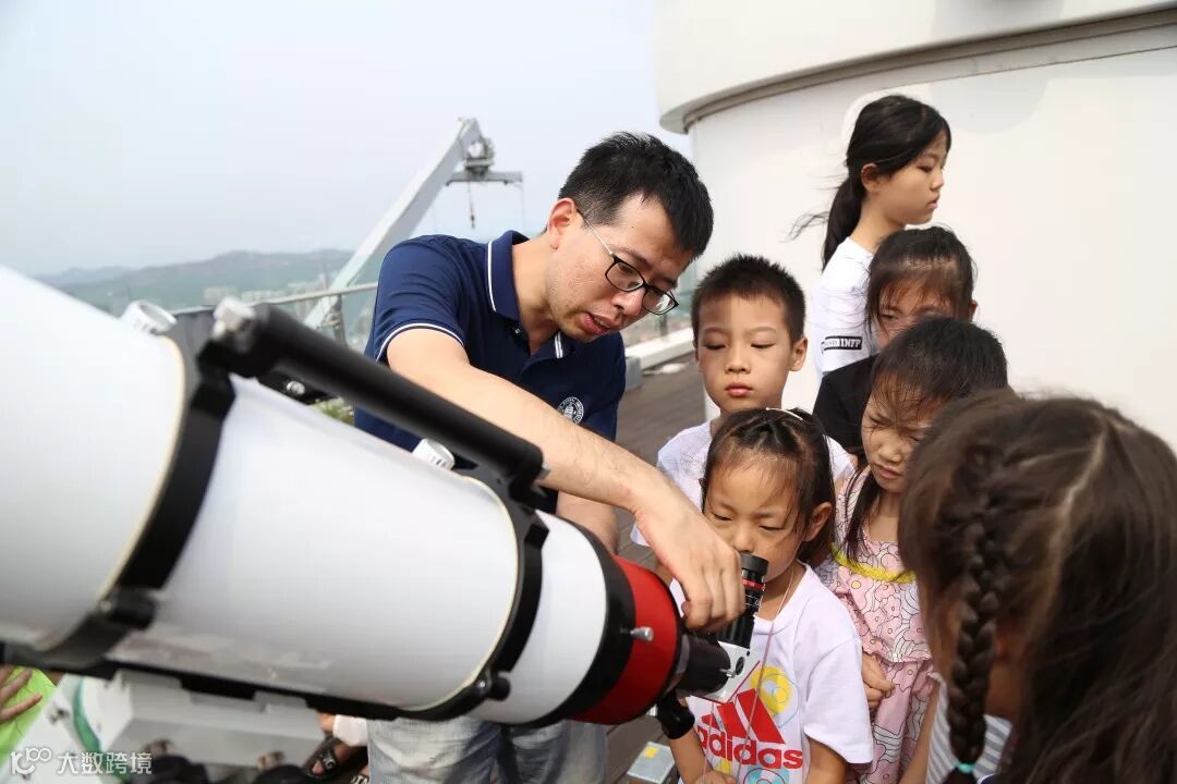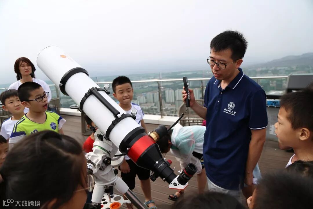 刚刚参加完天文科普论坛的北京师范大学天文系老师,不辞辛劳专程赶到研学游现场,带领研学游小学员们在安泰国际广场顶楼的天文台观测太阳。