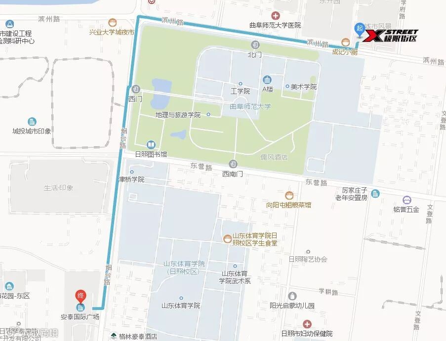 13:30 由极限街区滑板店集合出发,跟随Vans大旗,沿滨州路一路向西,至烟台路口左转向南至安泰国际广场MOKA商街外广场(全程约2KM)