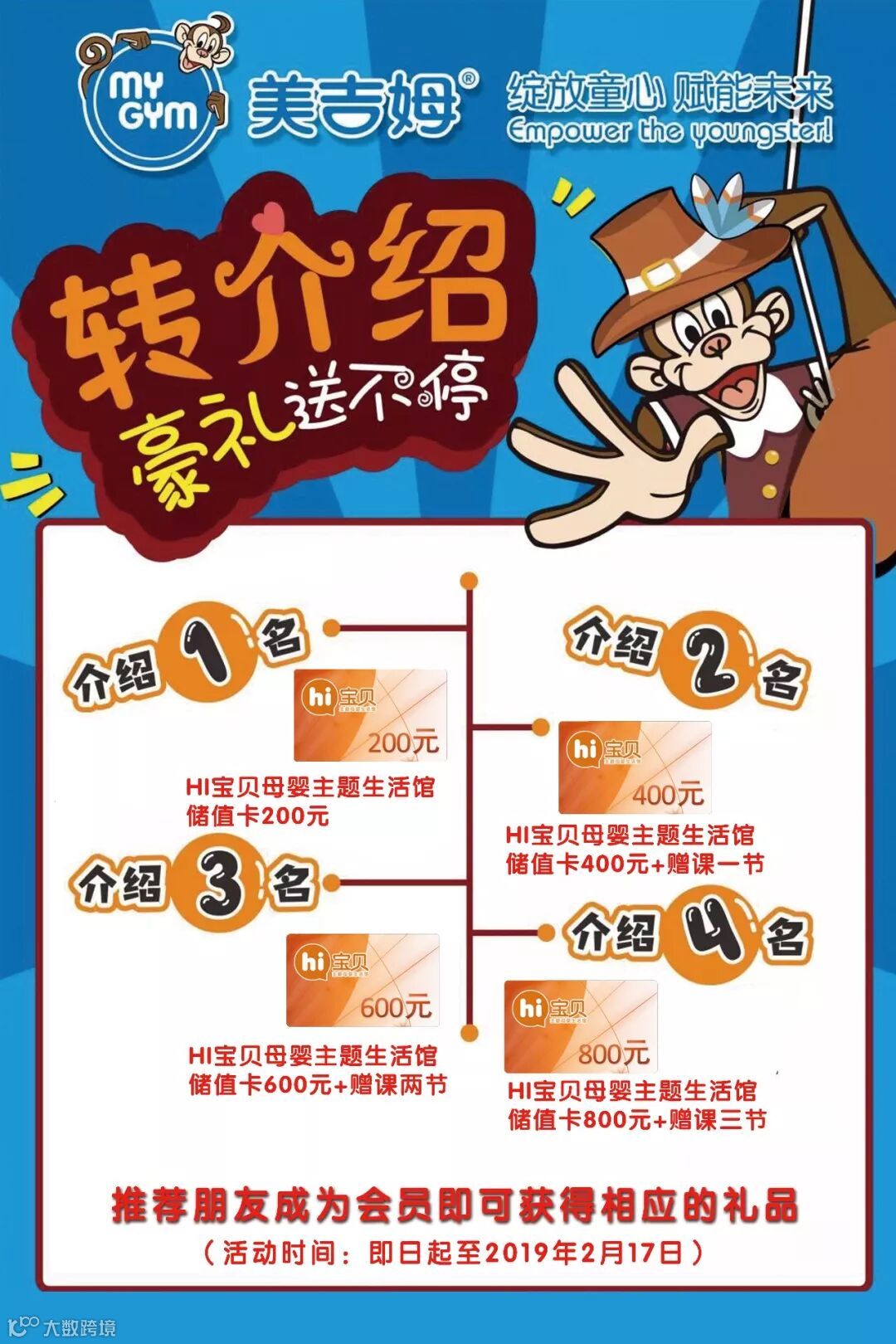 成功转介绍2名:可获得HI宝贝母婴主题生活馆400元储值卡+赠课一节