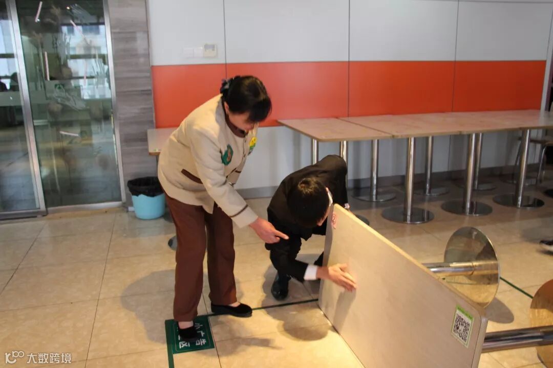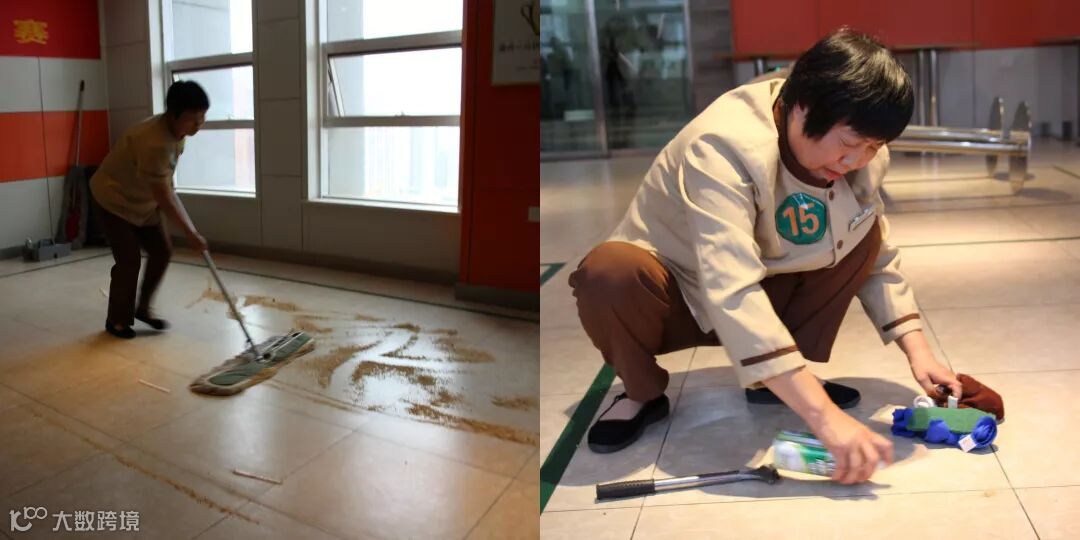 保洁人员对玻璃上的油污、墨汁、木屑、不干胶进行清理,小铲刀、抹布、清洁剂、玻璃刮轮番上阵,玻璃恢复光洁明亮。