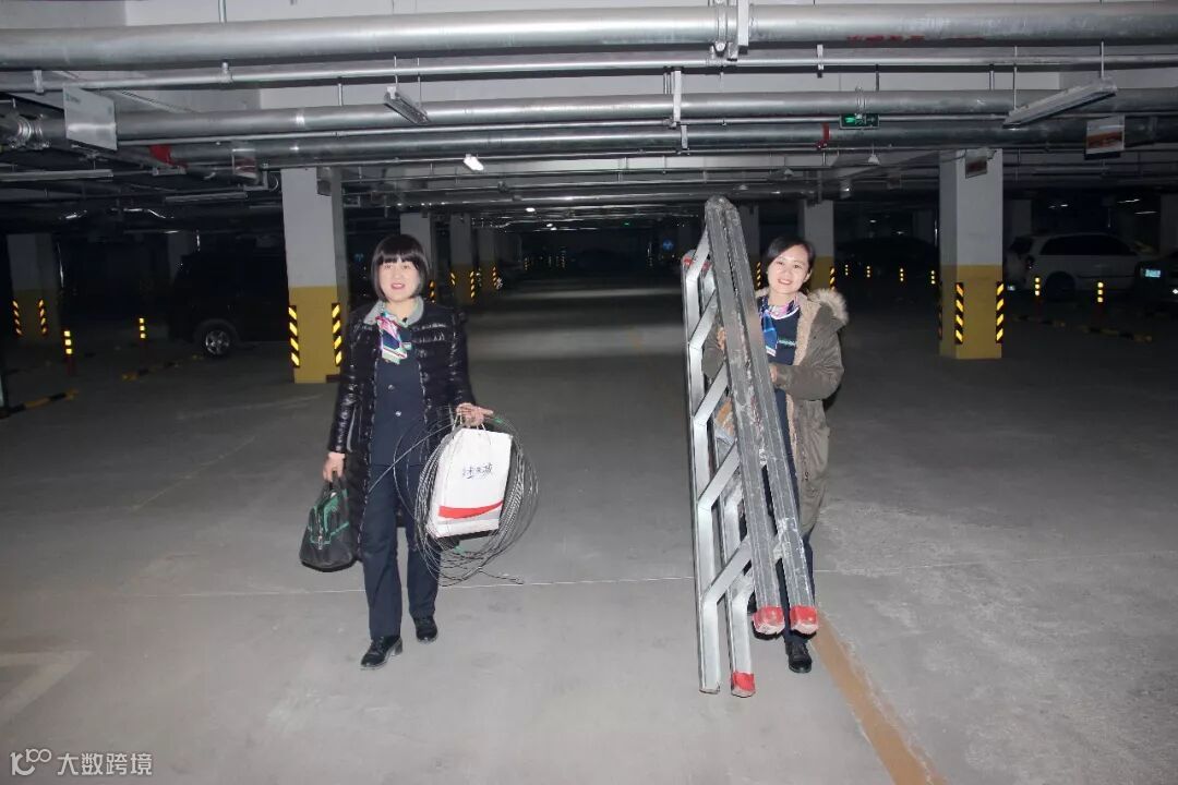 ▲孙媛媛和同事李谭穿过地下车库去帮业主恢复烟感器