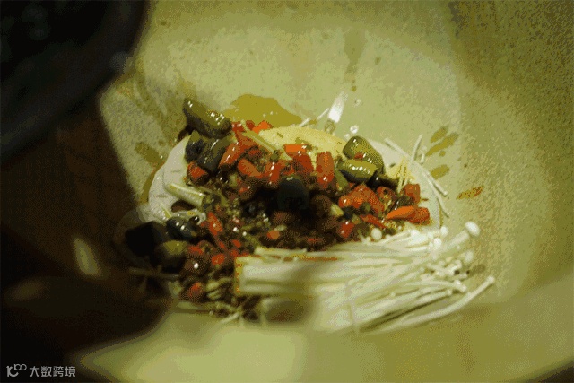 然后依次铺上各种食材和秘制底料