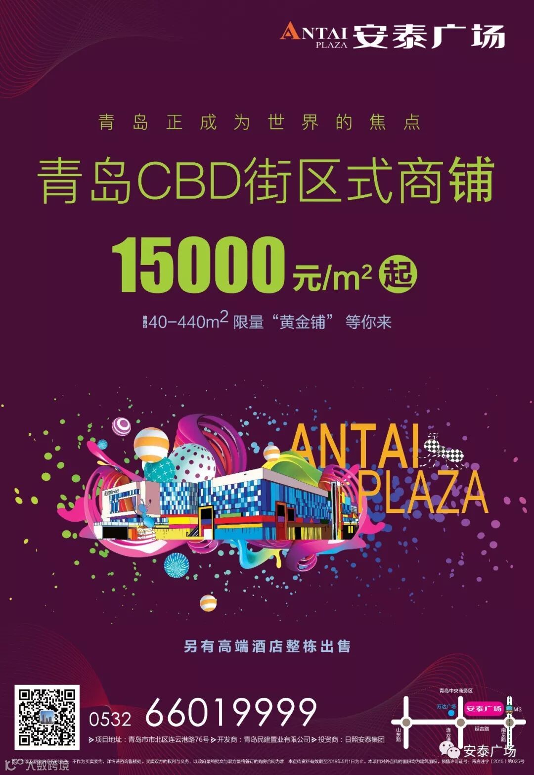 青岛安泰广场为本项目的推广名。以上宣传资料仅供参考,相关内容不排除因政府相关规划、规定及开发商未能控制的原因而发生变化,本公司保留对宣传资料修改的权利,最终以相关部门审批方案为准。对项目周边配套设施的介绍旨在提供相关信息,不意味着本公司对此作出了承诺,买卖双方的权利和义务以合同约定为准。