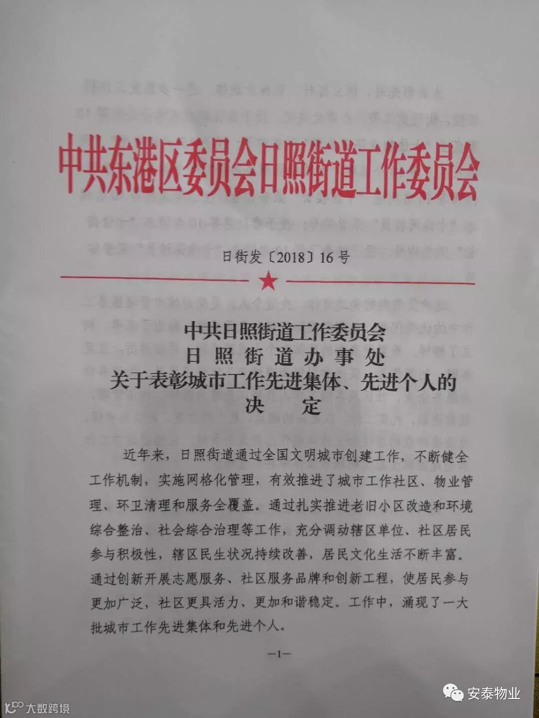 4月28日,日照街道隆重召开了日照街道城市工作暨创建国家生态园林城市动员会议。日照安泰物业服务有限公司荣获“十佳物业环卫公司”荣誉称号。