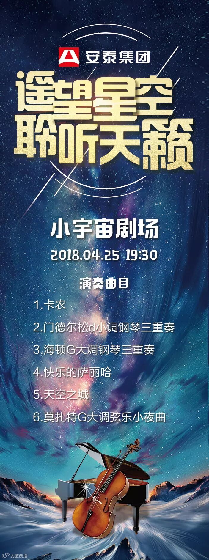 4月25日晚,安泰国际广场灯火辉煌,小宇宙剧场星光璀璨,安泰集团“遥望星空·聆听天籁”专场音乐会在这里精彩上演,安泰集团300余名员工观看了演出。