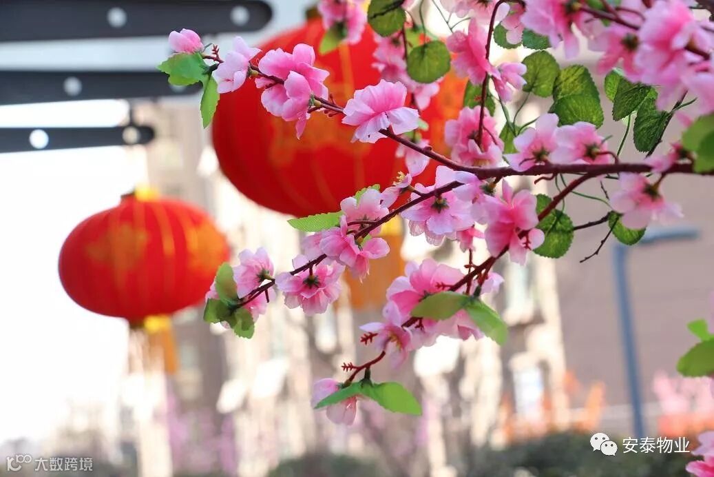 1、为营造喜庆、浓厚的节日氛围,丰富春节期间居民的文化生活,让安泰家人们过一个欢乐、祥和、亮丽的春节,安泰物业积极策划,提前部署,做好各项目春节亮化工作,全力营造节日氛围。物业工作人员将光秃秃的树枝装扮上树叶、桃花和彩灯,在这满目萧条的冬日里,增添一抹色彩,使各小区的景色美不胜收,走进每一个安泰小区,大红灯笼高高挂,七彩彩灯迎家人,年味十足。