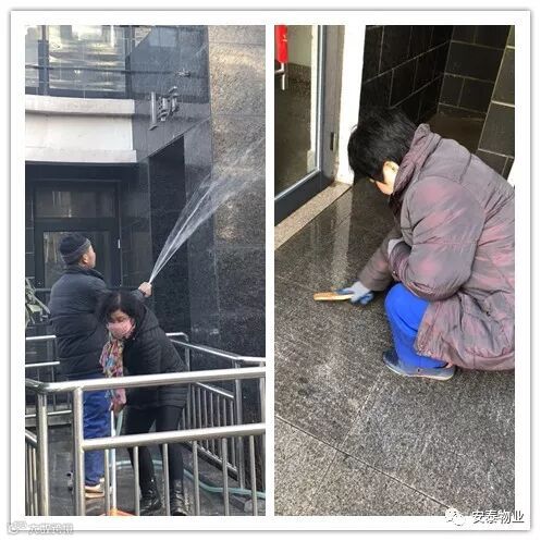 6、冬季风刮的比较大,单元门玻璃雨水棚上积攒了厚厚的灰尘,为了能让业主出入的环境更加整洁明亮,安泰易居对此进行了冲刷清理。