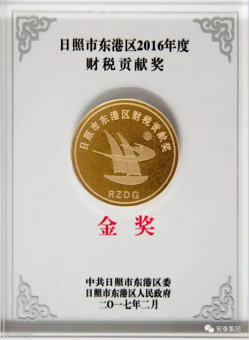 日照安泰集团以12413万突出的财税贡献荣获“东港区2016年度财税贡献奖”金奖,这是安泰集团连续四年获得该项殊荣。