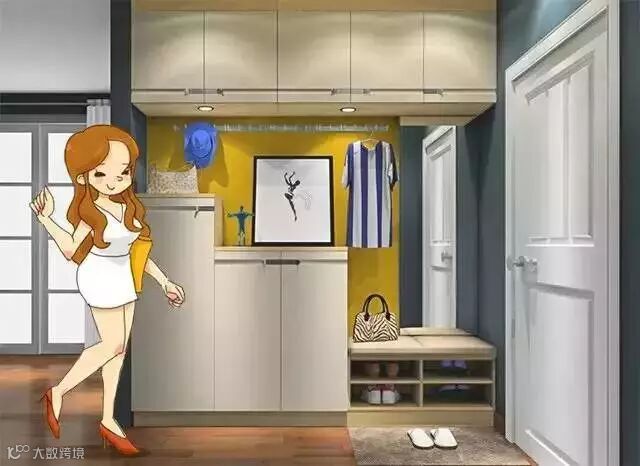延长客厅背景墙隔出一个玄关,高低鞋柜收纳冬靴凉鞋,更有吊柜、穿衣镜,换鞋凳,户型再小该有的功能一个都不能少!