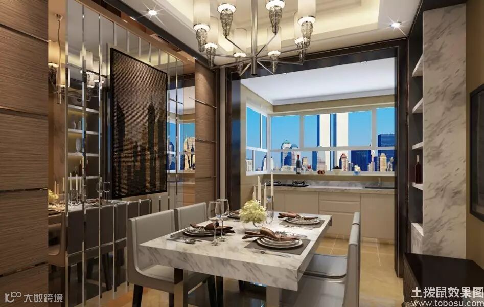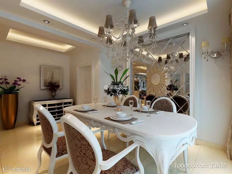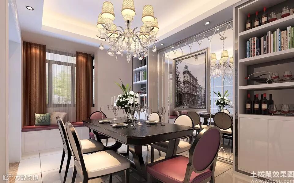 现代欧式餐厅背景墙效果图中背景墙采用镜面装饰,既有欧式典雅感又有现代的个性时尚感。再加上镜面上的纹路和太阳装饰和装饰画的搭配,整个餐厅空间就变得大方优雅又时尚啦。
