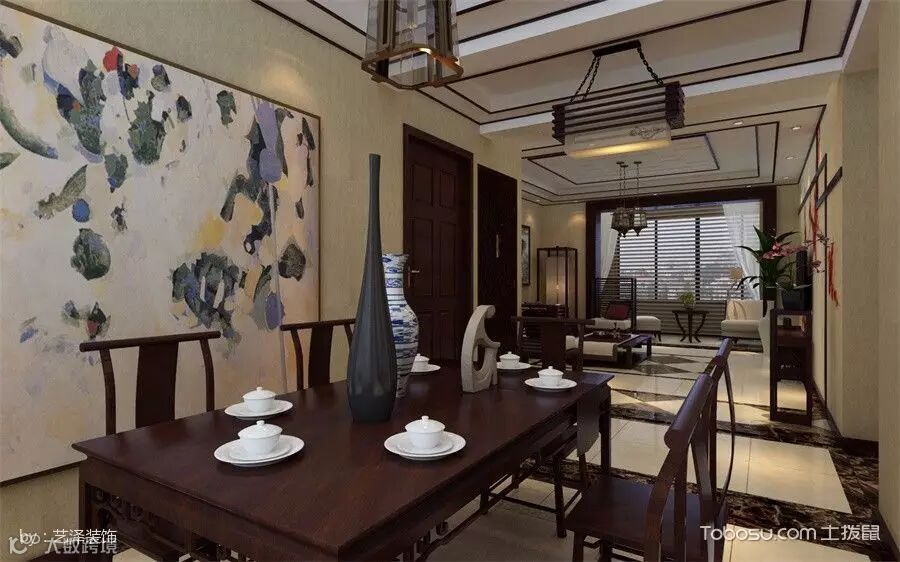 中式风格餐厅背景墙效果图中背景墙多以具有中国风的壁画装饰,且多以寓意吉祥富贵的花鸟为主,在视觉感官表现美观的同时,也迎合了风水学理论。